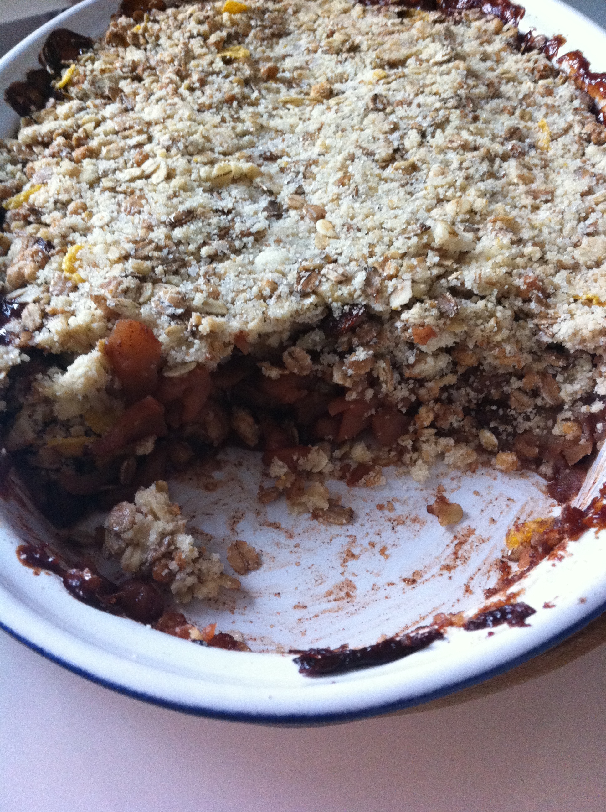 Intr-o tava, sau vas ceramic rezistent la foc, puneti amestecul de mere. Deasupra asezati in mod uniform amestecul de faina, cereal si unt, pana acoperiti merele.