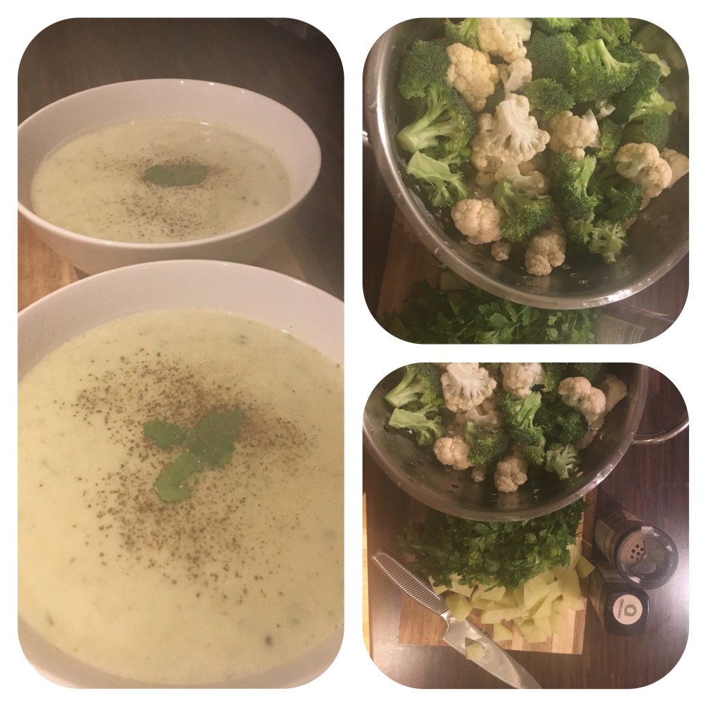 Conopida si broccoli, se desfac in florete si se spala. Se adauga in oala, peste ceapa rumenita. Cartoful curatat se taie cubulete si se adauga in oala. Se amesteca bine.